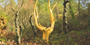 Arbre recouvert de feuilles d'or et cerné par quatre arbres calcinés, dans la forêt de Paimpont.